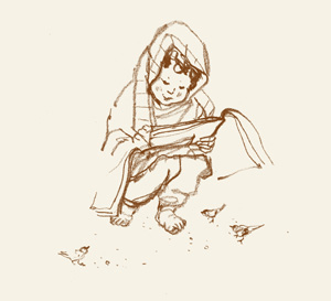 | ยามวสันตฤดู ทุ่งหญ้ามองโกเลียปกคลุมด้วยกุหลาบพันธุ์พื้นเมืองสีขาว ใจกลางดอกสีแดงก่ำ กองคาราวานย่ำผ่าน พ่อค้าวานิชเนื้อตัวสกปรก ขี่อูฐสูงใหญ่ขนหนา บรรทุกหีบห่อทรงกลม ครั้นยามหยุด พักแรมก็เปิดออก ดั่งหนึ่งผลทับทิมและเรื่องราวอัศจรรย์ทั้งปวงแห่งอาณาจักรหิมะ รัตนชาติสีดุจนภากระจ่าง หรือดั่งธารน้ำแข็ง รัตนชาติอันเปล่งประกายดุจแก้วและขนอ่อนจางของฝูงวิหคสีเทา ขนสัตว์สีขาวดุจหยาดน้ำแข็ง อีกทั้งพลอยเขียวครามหุ้มลายเงินก็ร่วงพรูลงบนฝ่ามือที่สั่นระริกของเหล่าวานิชนั้น (น. ๒๔) | |